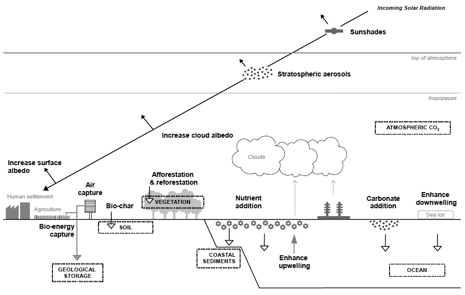 Reflecting sun away from the Earth by launching sunshades into space or injecting reflective manufactured particles into the stratosphere tops UEA’s list, showing the greatest potential to cool Earth back to pre-industrial temperatures by 2050. But not before 2100, and only when combined with serious greenhouse gas reductions.