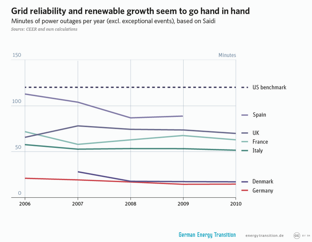 Last Friday Germany’s grid regulator released the 2013 data for grid reliability, and the figures have renewable energy advocates crowing. The latest numbers (released in German) reveal no sign of growing instability despite record levels of renewable energy on the grid — 28.5 percent of the power supplied in the first half of 2014. In fact, Germany’s grid is one of the world’s most reliable.
