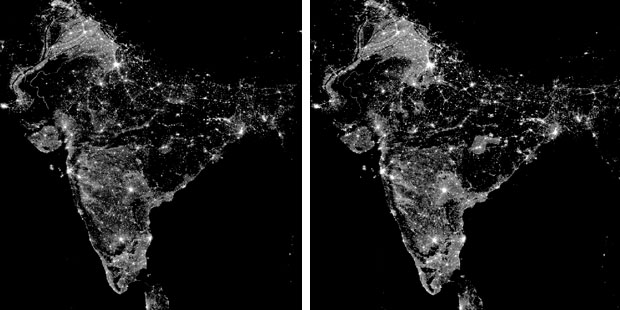They verified increasing levels of electrification by mapping nighttime illumination using NOAA satellite imagery and measuring each village’s brightest pixel (see digitized image below). Villages that were “barely eligible” for electrification (those with 300 to 450 residents) brightened significantly between 2001 and 2011, whereas the “barely ineligible” villages (with 150 to 300 residents) did not.