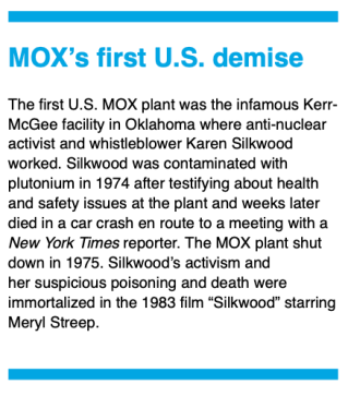 However, MOX Services’ two parent firms are not doing well. Chicago Bridge & Iron is the contractor that bungled the AP1000 projects (and was recently taken over by McDermott International). Paris-based Orano, which runs France’s MOX plant, is part of the former nuclear giant Areva whose troubled reactor projects contributed to its break-up by the French government in 2017.