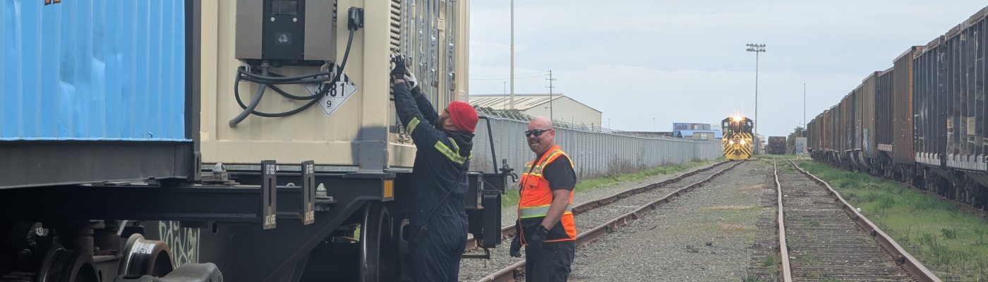 The star of this demonstration at the Port of San Francisco’s Pier 96 rail yard was a freight container that SunTrain had crammed full of lithium ion batteries and mounted on a standard 27-meter railcar…